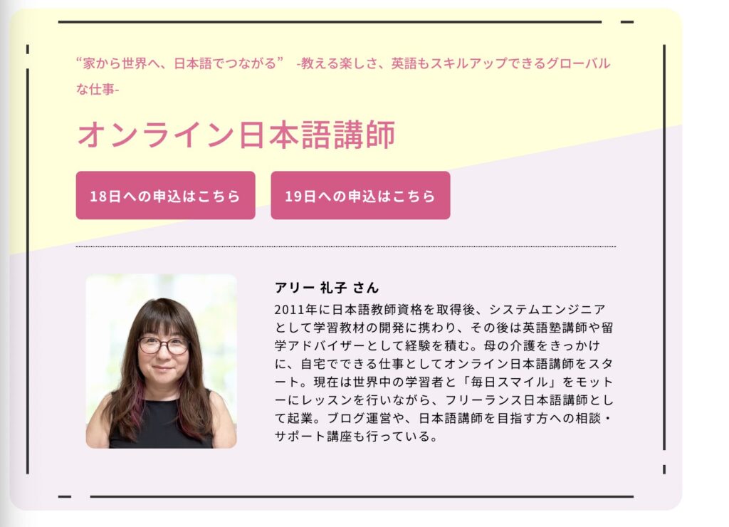 なんと、このたび、「女性しごと応援ナビ おしごと体験2025」 のイベントとして、私が担当する 「オンライン日本語講師のおしごと体験」 を開催できる運びとなりました!